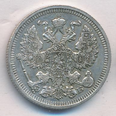 Лицевая сторона — гербовый орел, оборотная —обозначение номинала (20 копеекъ), окруженное венком из лавровой и дубовой ветвей и дата.
