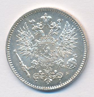 Лицевая сторона — российский двуглавый орел с гербом Великого княжества Финляндского на груди, оборотная — номинал и дата в венке из дубовых листьев. Проба — 750, нормативный вес — 2,55 грамма, гурт рубчатый.