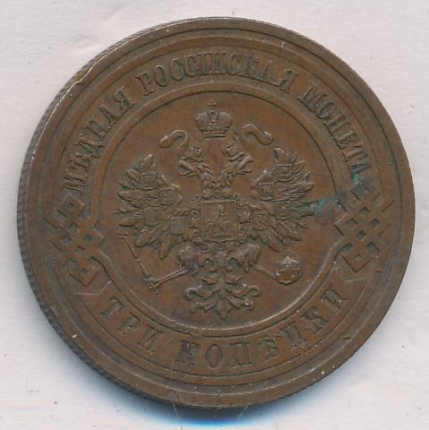 Лицевая сторона — двуглавый орел, надпись МЕДНАЯ РОССIЙСКАЯ МОНЕТА и обозначение номинала (три копейки); оборотная — обозначение номинала (3 копейки) в бусовом ободке и дата. Нормативный вес — 9,83 грамма, гурт рубчатый.