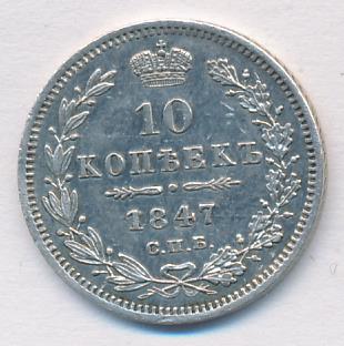 Лицевая сторона — новый гербовый орел с поднятыми крыльями, оборотная —обозначение номинала (10 копеекъ), окруженное венком из лавровой и дубовой ветвей и дата. Проба — 868, нормативный вес — 2,07 грамма.