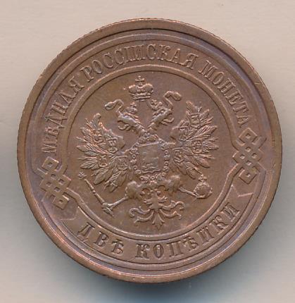 Лицевая сторона — двуглавый орел, надпись МЕДНАЯ РОССIЙСКАЯ МОНЕТА и обозначение номинала (две копейки); оборотная — обозначение номинала (2 копейки) в бусовом ободке и дата. Нормативный вес — 6,55 грамма, гурт рубчатый.