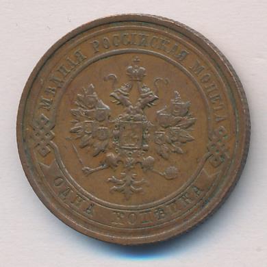 Лицевая сторона — двуглавый орел, надпись МЕДНАЯ РОССIЙСКАЯ МОНЕТА и обозначение номинала (одна копейка); оборотная — обозначение номинала (1 копейка) в бусовом ободке и дата. Нормативный вес — 3,28 грамма, гурт рубчатый.