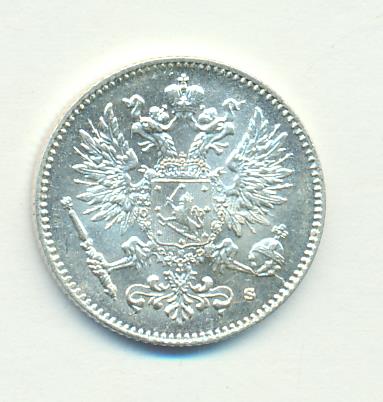 Лицевая сторона — российский двуглавый орел с гербом Великого княжества Финляндского на груди, оборотная — номинал и дата в венке из дубовых листьев. Проба — 750, нормативный вес — 2,55 грамма, гурт рубчатый.