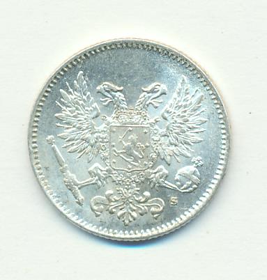 Лицевая сторона — российский двуглавый орел с гербом Великого княжества Финляндского на груди, оборотная — номинал и дата в венке из дубовых листьев. Проба — 750, нормативный вес — 2,55 грамма, гурт рубчатый.