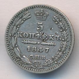 Лицевая сторона — новый гербовый орел с поднятыми крыльями, оборотная —обозначение номинала (5 копеекъ), окруженное венком из лавровой и дубовой ветвей и дата. Проба — 868, нормативный вес — 1,04 грамма.