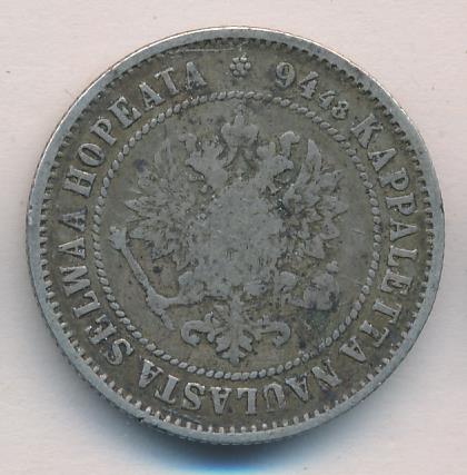 Лицевая сторона — российский двуглавый орел с гербом Великого княжества Финляндского на груди в кольцевой надписи с указанием количества штук (94,48) из фунта сплава серебра, оборотная — номинал и дата в венке из дубовых листьев. Проба — 868, нормативный вес — 5,18 грамма, гурт рубчатый.