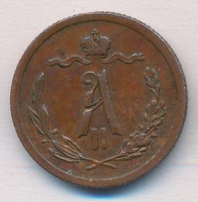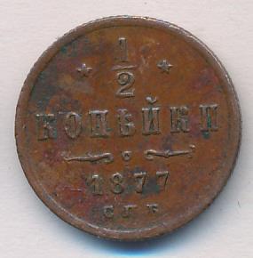 Лицевая сторона — вензель Александра II в венке из лавровой и дубовой ветвей; оборотная — обозначение номинала (1/2 копейки) и дата. Нормативный вес — 1,64 грамма, гурт рубчатый.