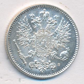 Лицевая сторона — российский двуглавый орел с гербом Великого княжества Финляндского на груди, оборотная — номинал и дата в венке из дубовых листьев. Проба — 750, нормативный вес — 2,55 грамма, гурт рубчатый.