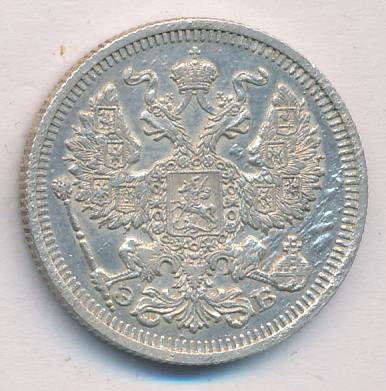 Лицевая сторона — гербовый орел, оборотная —обозначение номинала (20 копеекъ), окруженное венком из лавровой и дубовой ветвей и дата.