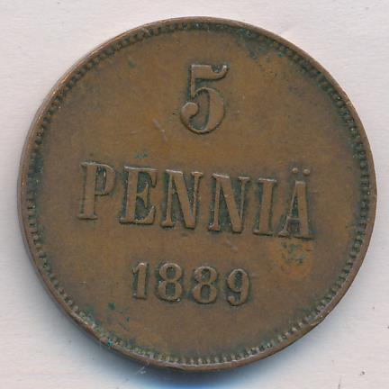 Лицевая сторона — вензель Александра II, оборотная — номинал (5 PENNIA) и дата. Нормативный вес — 6,40 грамма, гурт гладкий.