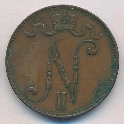 Лицевая сторона — вензель Александра II, оборотная — номинал (5 PENNIA) и дата. Нормативный вес — 6,40 грамма, гурт гладкий.