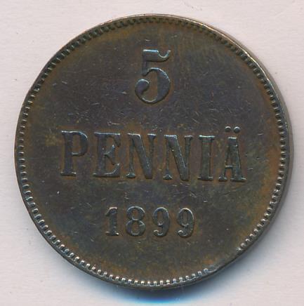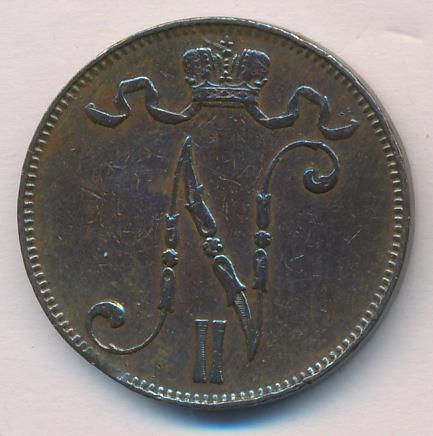 Лицевая сторона — вензель Александра II, оборотная — номинал (5 PENNIA) и дата. Нормативный вес — 6,40 грамма, гурт гладкий.