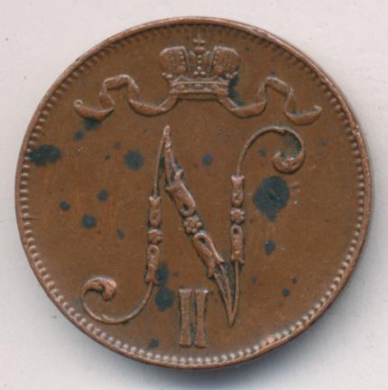 Лицевая сторона — вензель Александра II, оборотная — номинал (5 PENNIA) и дата. Нормативный вес — 6,40 грамма, гурт гладкий.
