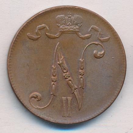Лицевая сторона — вензель Александра II, оборотная — номинал (5 PENNIA) и дата. Нормативный вес — 6,40 грамма, гурт гладкий.