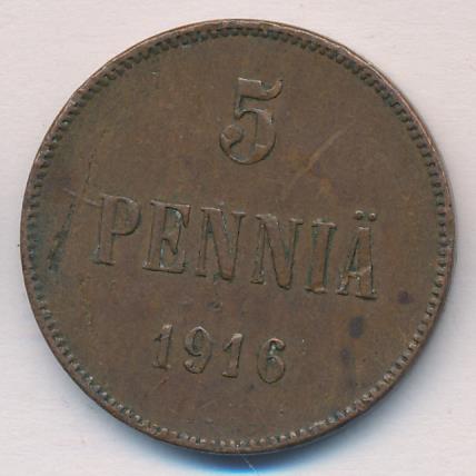 Лицевая сторона — вензель Александра II, оборотная — номинал (5 PENNIA) и дата. Нормативный вес — 6,40 грамма, гурт гладкий.