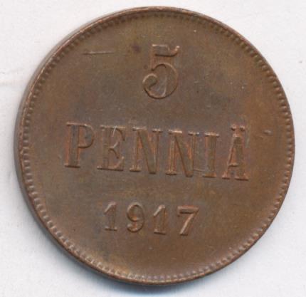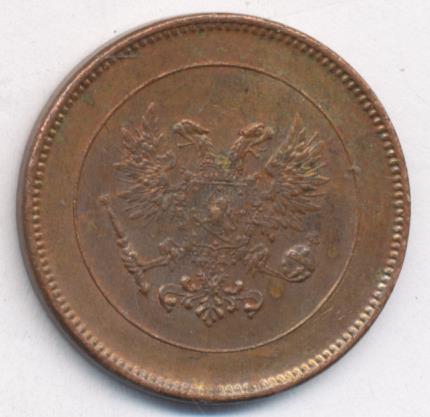 Лицевая сторона — вензель Александра II, оборотная — номинал (5 PENNIA) и дата. Нормативный вес — 6,40 грамма, гурт гладкий.