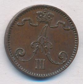 Лицевая сторона — вензель Александра II, оборотная — номинал (1 PENNIA) и дата. Нормативный вес — 1,28 грамма, гурт гладкий.