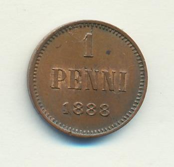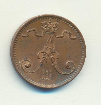 Лицевая сторона — вензель Александра II, оборотная — номинал (1 PENNIA) и дата. Нормативный вес — 1,28 грамма, гурт гладкий.