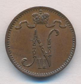 Лицевая сторона — вензель Александра II, оборотная — номинал (1 PENNIA) и дата. Нормативный вес — 1,28 грамма, гурт гладкий.