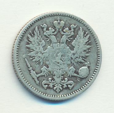 Лицевая сторона — российский двуглавый орел с гербом Великого княжества Финляндского на груди, оборотная — номинал и дата в венке из дубовых листьев. Проба — 750, нормативный вес — 2,55 грамма, гурт рубчатый.