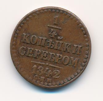 Лицевая сторона — вензель Николая I в бусовом ободке, оборотная — надпись «1/4 КОПЕЙКИ СЕРЕБРОМ» и дата. Нормативный вес — 2,56 грамма, гурт гладкий.