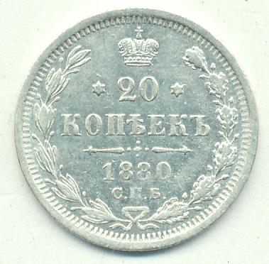 Лицевая сторона — гербовый орел, оборотная —обозначение номинала (20 копеекъ), окруженное венком из лавровой и дубовой ветвей и дата.