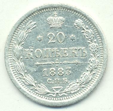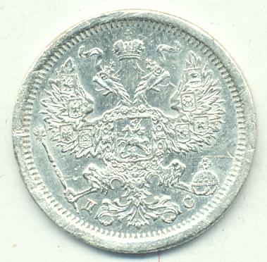 Лицевая сторона — гербовый орел, оборотная —обозначение номинала (20 копеекъ), окруженное венком из лавровой и дубовой ветвей и дата.