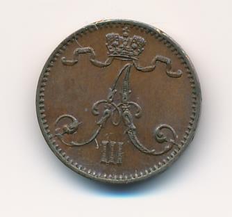 Лицевая сторона — вензель Александра II, оборотная — номинал (1 PENNIA) и дата. Нормативный вес — 1,28 грамма, гурт гладкий.