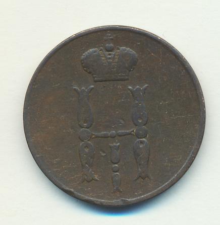 Лицевая сторона — вензель Николая I, оборотная — обозначение номинала (копейка) и дата. Нормативный вес — 5,12 грамма, гурт гладкий.