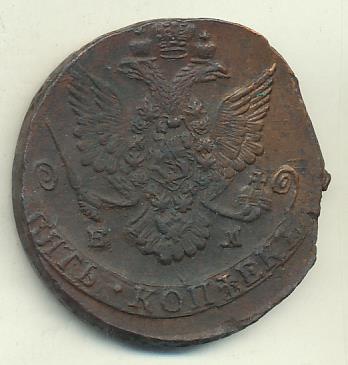 Лицевая сторона — двуглавый орел (выделяют 17 типов орла) и обозначение номинала (пять копеекъ), оборотная — вензель Екатерины II и дата. Нормативный вес — 51,19 грамма, гурт — сетка или шнур.
