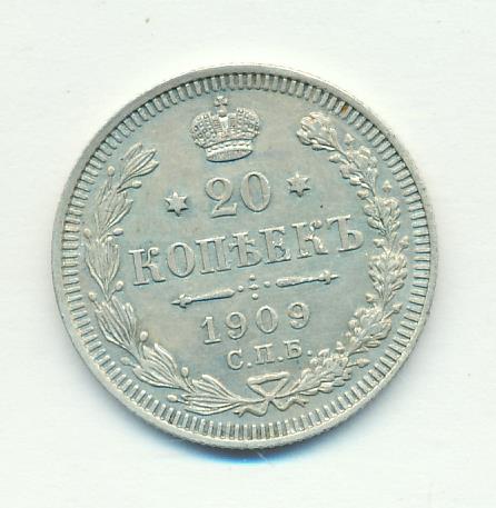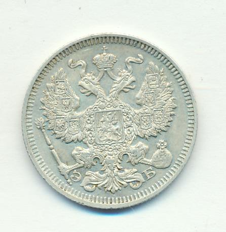 Лицевая сторона — гербовый орел, оборотная —обозначение номинала (20 копеекъ), окруженное венком из лавровой и дубовой ветвей и дата.