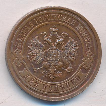 Лицевая сторона — двуглавый орел, надпись МЕДНАЯ РОССIЙСКАЯ МОНЕТА и обозначение номинала (две копейки); оборотная — обозначение номинала (2 копейки) в бусовом ободке и дата. Нормативный вес — 6,55 грамма, гурт рубчатый.