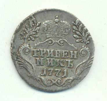 Лицевая сторона — портрет императрицы и надпись «Б М ЕКАТЕРИНА II IМП I САМОД ВСЕРОС», оборотная — обозначение номинала (гривенникъ) и дата. Проба — 750, нормативный вес — 2,37 грамма, гурт — шнур.