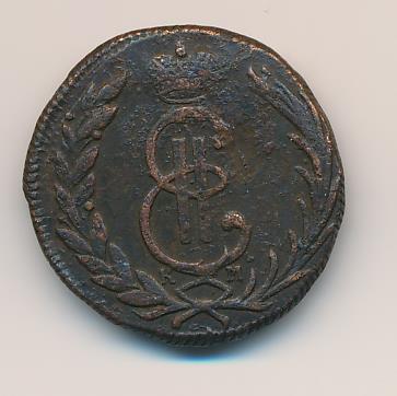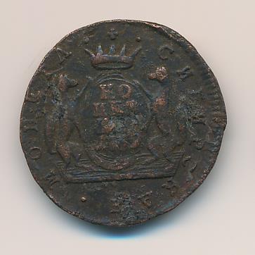 Лицевая сторона - два соболя поддерживают щит с обозначением номинала (копейка) под короной, надпись «СИБИРСКАЯ МОНЕТА». Оборотная — вензель Екатерины II в венке из пальмовой и лавровой ветвей. Гурт — шнур, вес — 6,55 грамма.