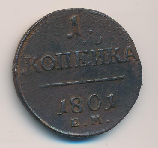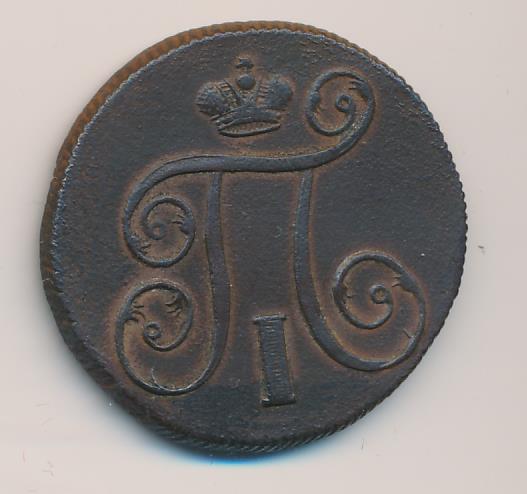 Лицевая сторона — вензель Павла I под короной, оборотная — номинал (1 копейка) и дата. Нормативный вес — 10,24 грамма, гурт — шнур.