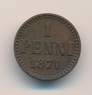 Лицевая сторона — вензель Александра II, оборотная — номинал (1 PENNIA) и дата. Нормативный вес — 1,28 грамма, гурт гладкий.