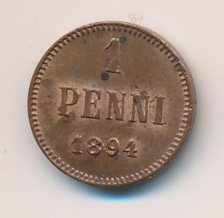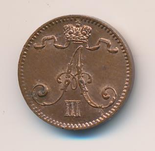 Лицевая сторона — вензель Александра II, оборотная — номинал (1 PENNIA) и дата. Нормативный вес — 1,28 грамма, гурт гладкий.