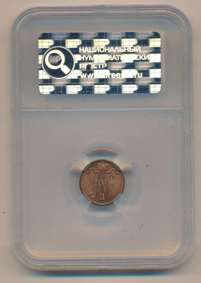 Лицевая сторона — вензель Александра II, оборотная — номинал (1 PENNIA) и дата. Нормативный вес — 1,28 грамма, гурт гладкий.