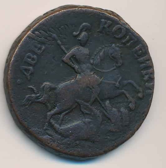 Лицевая сторона — Георгий Победоносец и обозначение номинала (две копейки) в картуше, оборотная — сложный симметричный вензель Елизаветы Петровны и дата. Нормативный вес — 20,48 грамма.