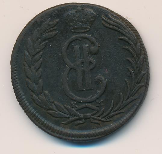 Лицевая сторона - два соболя поддерживают щит с обозначением номинала (две копейки) под короной, надпись «СИБИРСКАЯ МОНЕТА». Оборотная — вензель Екатерины II в венке из пальмовой и лавровой ветвей. Гурт — надпись «колыванская медь» или шнур. Вес — 13,10 грамма.