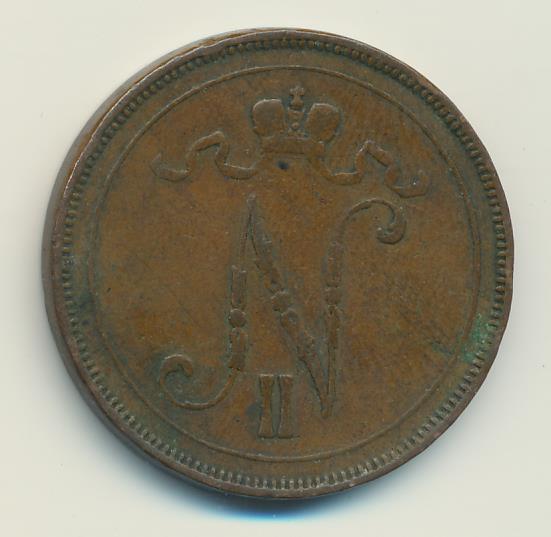 Лицевая сторона — вензель Александра II, оборотная — номинал (10 PENNIA) в венке из дубовых ветвей и дата. Нормативный вес — 12,80 грамма, гурт гладкий.