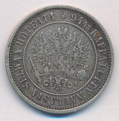 Лицевая сторона — российский двуглавый орел с гербом Великого княжества Финляндского на груди в кольцевой надписи с указанием количества штук (94,48) из фунта сплава серебра, оборотная — номинал и дата в венке из дубовых листьев. Проба — 868, нормативный вес — 5,18 грамма, гурт рубчатый.