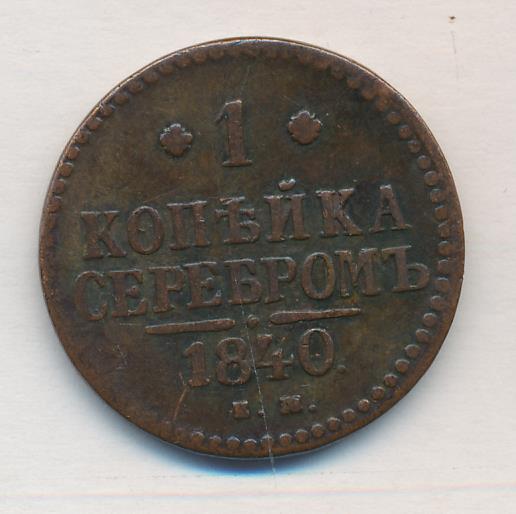На новых монетах равенство серебряному курсу указано прямо в номинале: «1 КОПЕЙКА СЕРЕБРОМ». Указ об их выпуске следует 6 сентября 1840 года («О новой медной монете на серебро 16-рублевого в пуде достоинства»). Массовая чеканка началось за год до этого на Екатеринбургском (знак ЕМ) и Сузунском (знак СМ) дворах. В качестве временной меры в 1840-1843 годах к ним подключается Ижорский завод (знак СПМ). С 1844 года после «значительного скопления медной монеты в народном обращении» в Екатеринбурге производство прекращается, а в Сузуне сокращается.