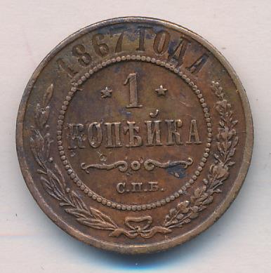 Указом от 21 марта 1867 года Александр II утверждает 50-рублевую стопу для медных монет. Новые монеты получают усложненное оформление, для затруднения подделки часть надписей делают вдавленными. Дополнительным отличием от прежних выпусков служит рубчатый гурт (чеканка ведется без предварительного гурчения кружков в неразъемном рубчатом кольце).