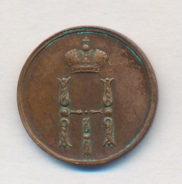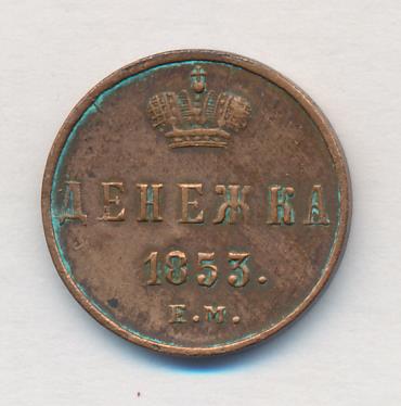 Лицевая сторона — вензель Николая I, оборотная — обозначение номинала (денежка) и дата. Нормативный вес — 2,56 грамма, гурт гладкий.