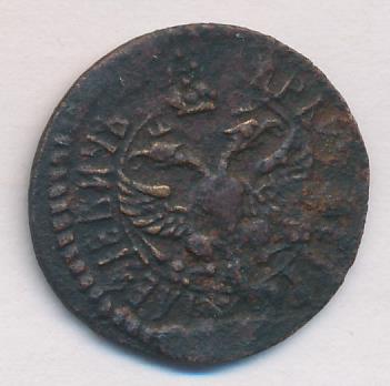 На лицевой стороне — гербовый орел и надпись «царь петр алексеевич», на оборотной - «всея россии самодержец» и обозначение номинала (полушка).