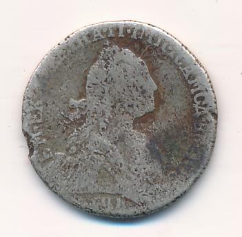 Лицевая сторона — портрет императрицы и надпись «Б М ЕКАТЕРИНА II IМП I САМОД ВСЕРОС», оборотная — обозначение номинала (гривенникъ) и дата. Проба — 750, нормативный вес — 2,37 грамма, гурт — шнур.