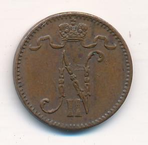 Лицевая сторона — вензель Александра II, оборотная — номинал (1 PENNIA) и дата. Нормативный вес — 1,28 грамма, гурт гладкий.