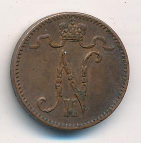 Лицевая сторона — вензель Александра II, оборотная — номинал (1 PENNIA) и дата. Нормативный вес — 1,28 грамма, гурт гладкий.