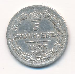 Лицевая сторона — новый гербовый орел с поднятыми крыльями, оборотная —обозначение номинала (5 копеекъ), окруженное венком из лавровой и дубовой ветвей и дата. Проба — 868, нормативный вес — 1,04 грамма.